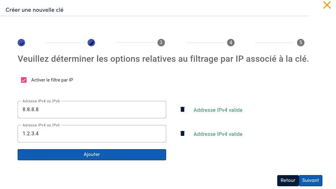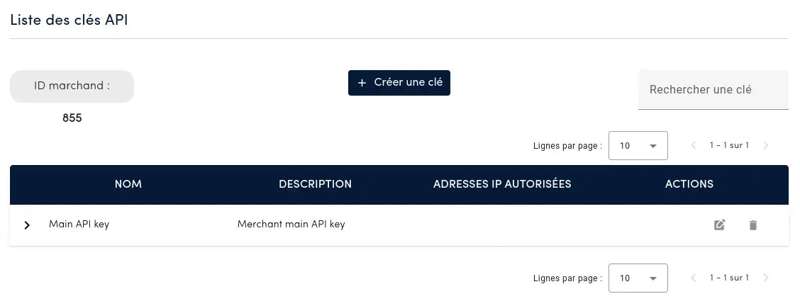 On each API key row, in the “Actions” column, an Edit button is available to change the settings of a key. This edition process is the same as the creation process, except that you will not be able to view the key. Every setting can be edited.Changes to permissions and IP address restrictions are taken into account as soon as they are modified. Special attention is required before committing changes.